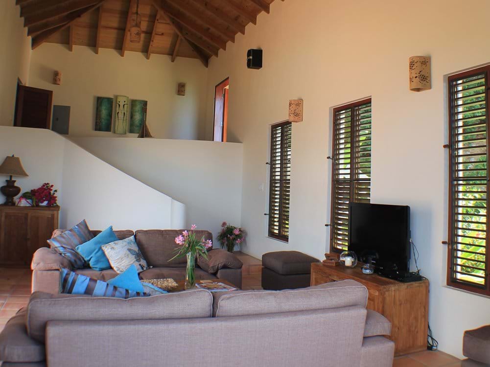 From the Dining Room you have easy access down a curving opening arms staircase to the splendorous main deck, planters are filled with local palms, bird of paradise, heliconia, gingers & bougainvillea. Once at the pool, take a dip, enjoy the views & relax in the sun on the comfortable sun beds, there is an outdoor shower on the deck for your convenience.  In the evening enjoy this area with a cocktail, watch the sun go down, daydream at the fabulous pool colour sequences (programme your personal colour favourites). You might want to rev it up a bit, put on some music & have some friends over you have met during your stay.