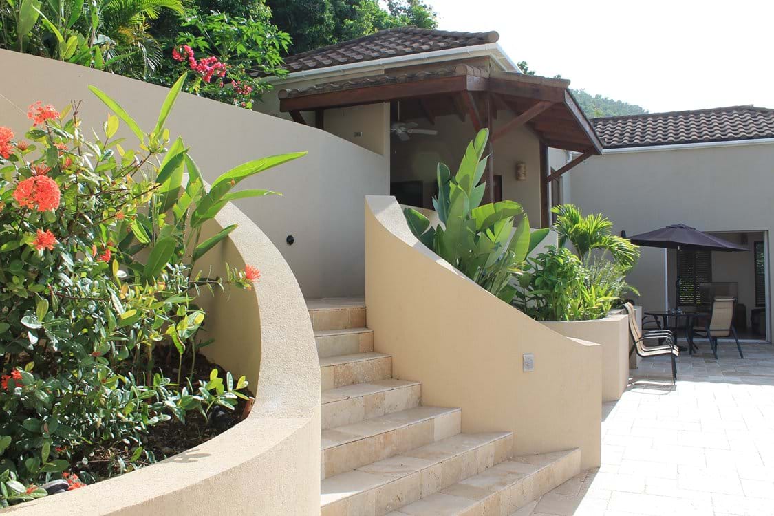 The mezzanine leads you to the Kitchen with its well-appointed high end units with granite counter-tops & stainless steel appliances.  Even the kitchen sink is a great place to look out at the amazing sea view.  Should you need any provisions for your arrival, just let us know & this can easily be arranged. The Dining Room beacons you from the kitchen with its majestic views of the islands. The glass & stone table is bespoke in this open air pavilion & gives a nice airy feeling to your dining experience. The dining area is also a great place at night which provides an elegant setting for dinner, whether you are cooking yourself or if you decide to bring a chef in.