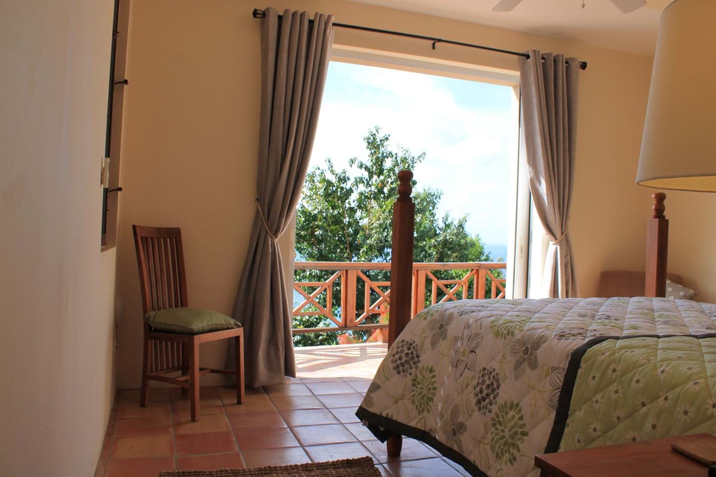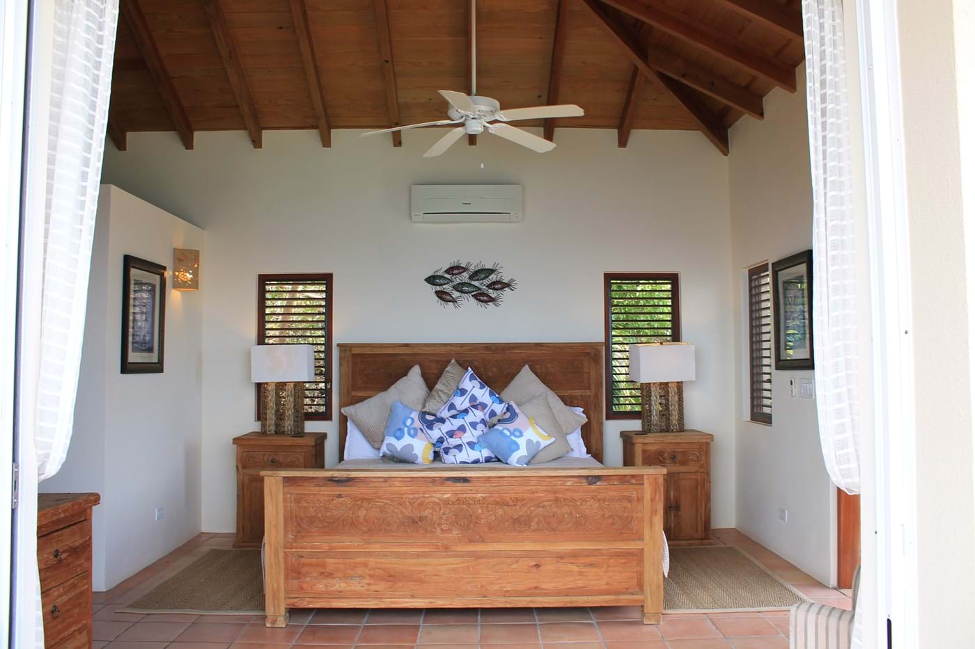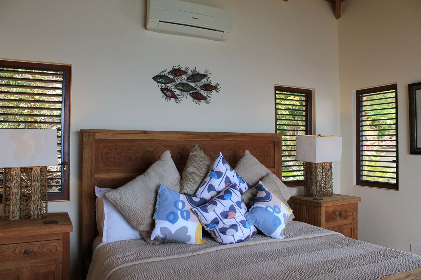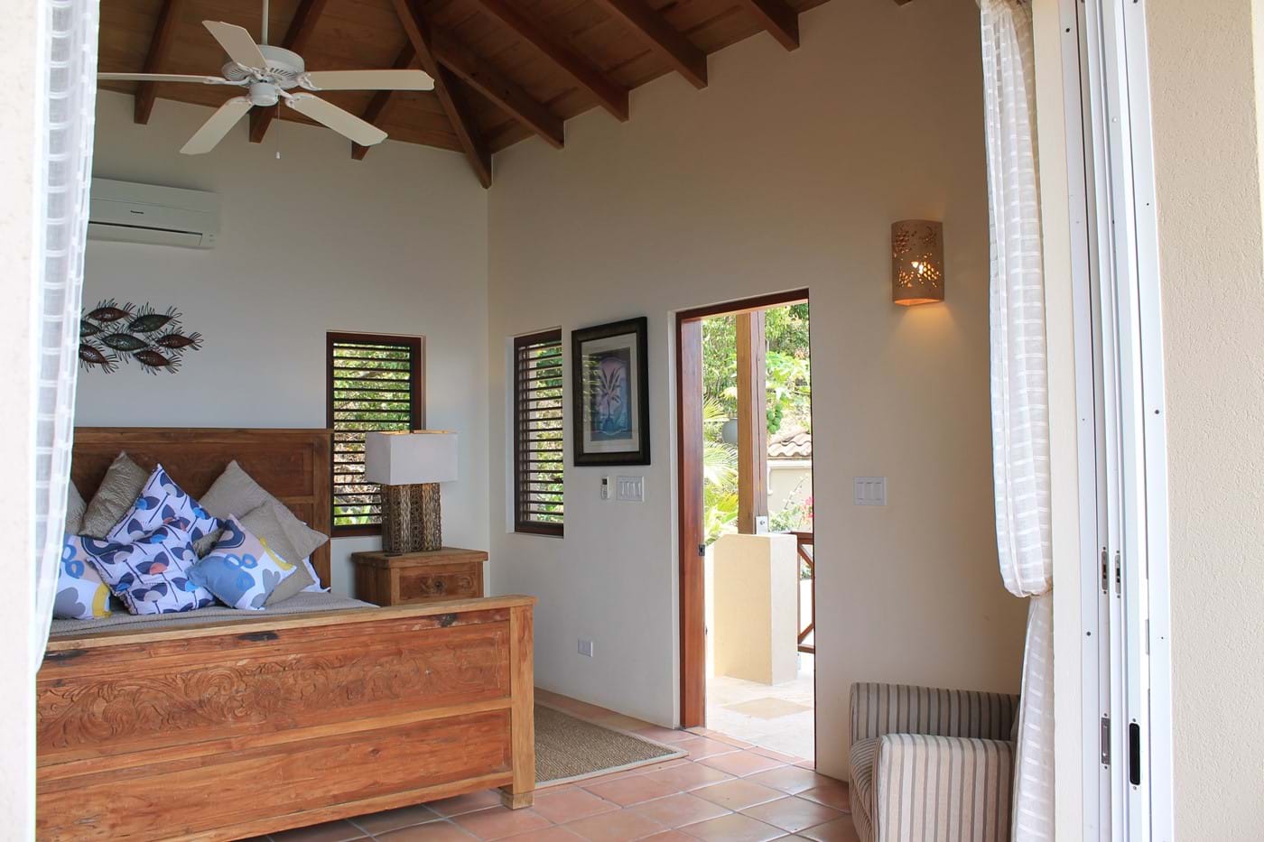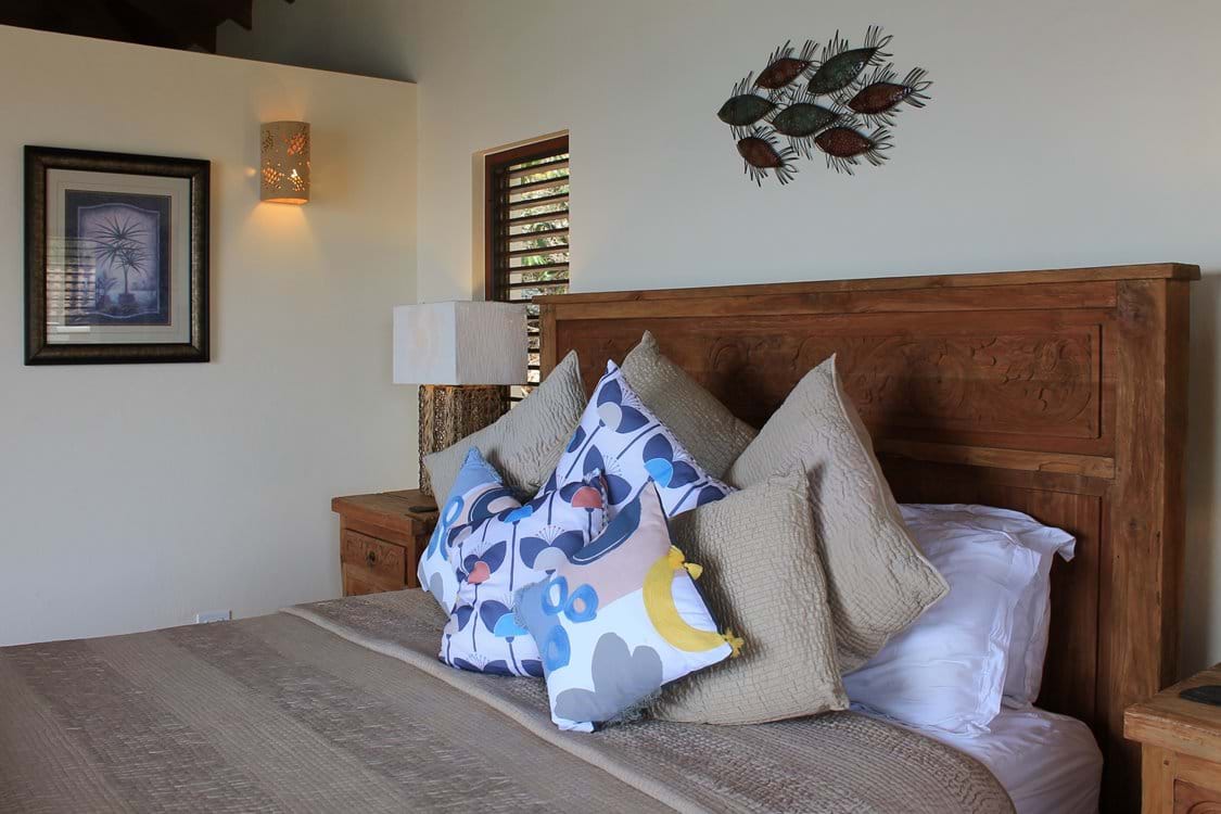 The bedroom pavilion offers an upper level Master Suite. This has beautiful views of the islands & beyond from the balcony & spacious outdoor private deck. The bathroom is finished with a gorgeous stone Travertine & natural pebbles, the oversized shower offers you an invigorating experience. You can gazel at the wonderful wood ceiling as you look up from your king size bed handcrafted in reclaimed teak from Bali. You will be sleeping under Egyptian cotton percale which will give you a luxurious night’s sleep.  If you stay in October, there is a wonderful Jacaranda tree full of cotton like flowers which cascades over the outdoor private terrace leading out from the bathroom.  There is also an extra single bed which can be used, should you wish to have one of the children in with you.