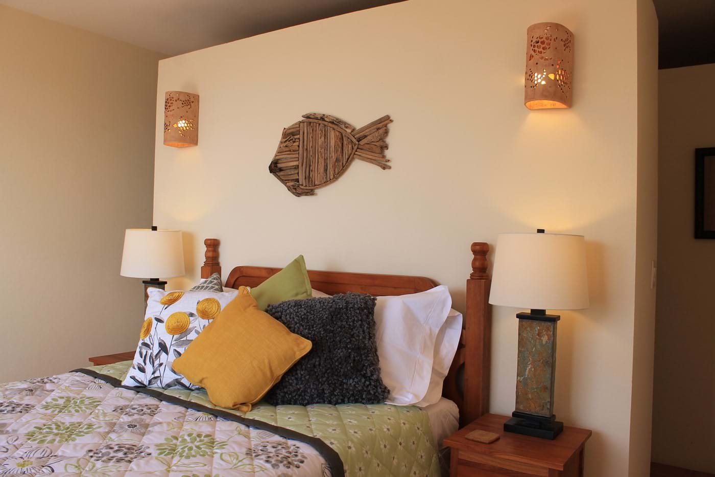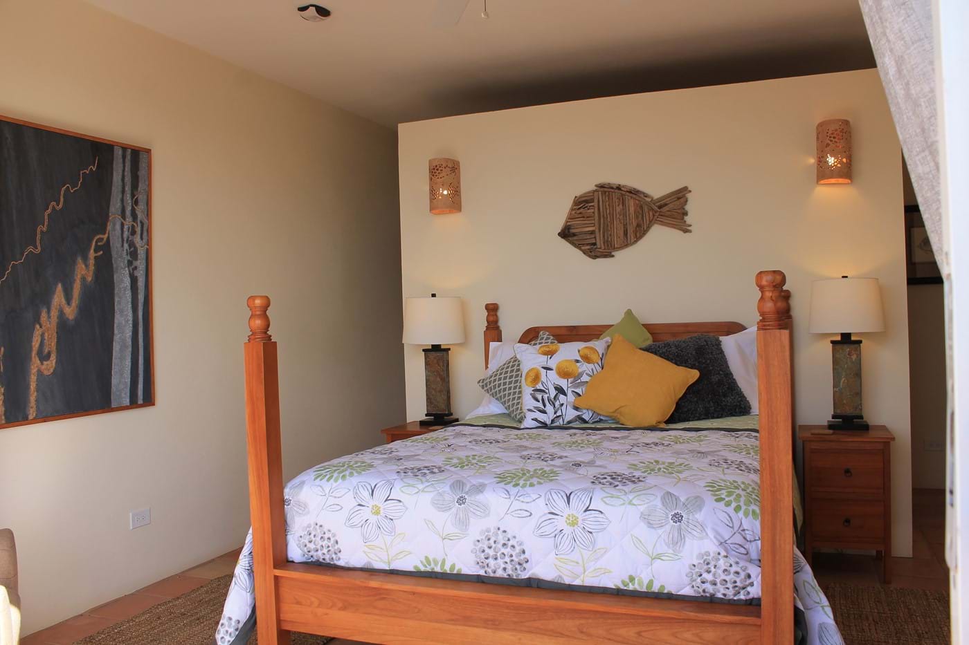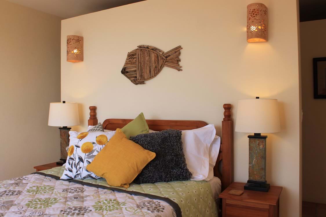 The third bedroom is very private & leads down from the main deck via steps to an outdoor space overlooking trees & landscape. You can enjoy the sea views & ocean sounds at night if you wish to. This bedroom has a low 4 poster Queen Bed with local art work to give a contemporary feel to this space.  Again luxury Egyptian cotton is featured throughout the property.  The bathroom is finished with stone Travertine and natural pebbles in your lovely spacious walk in shower. At Alfresco you can enjoy the privacy of this bedroom.  Ideal for 2 couples staying, so you have some privacy.