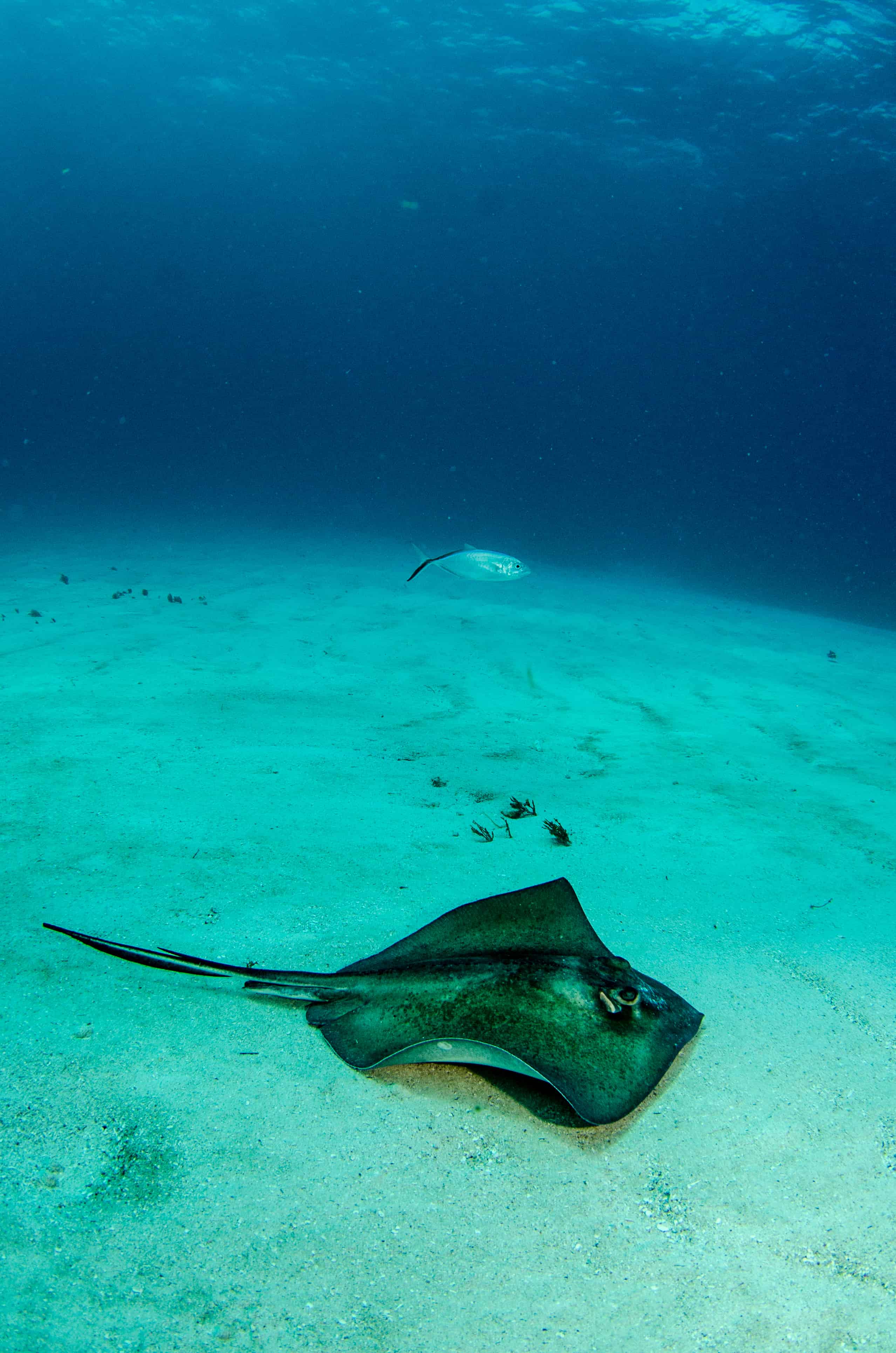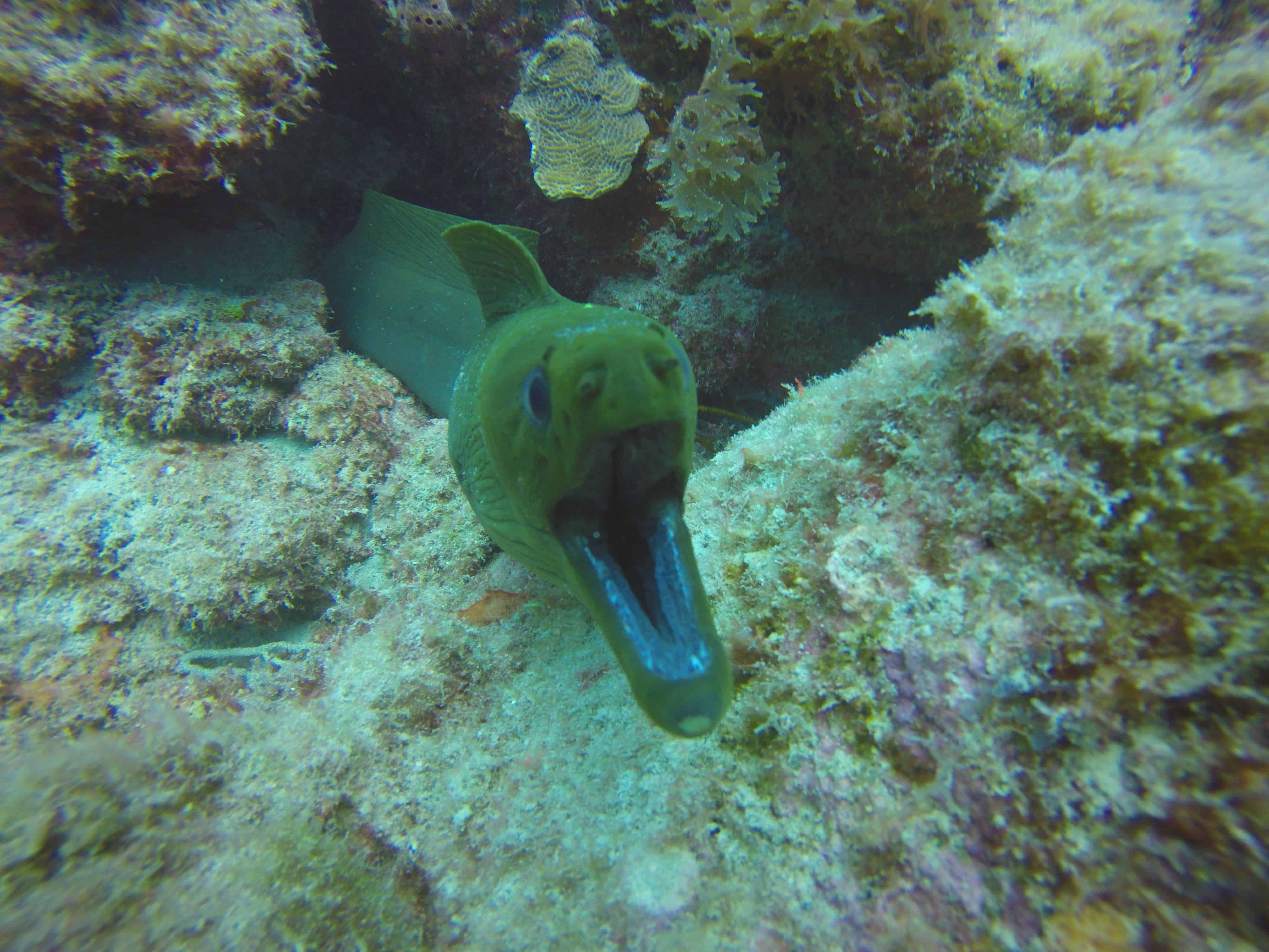 30-60 feet deep & open to the elements of the Caribbean Sea. You will see ample notable fish, Eagle Rays, Stingrays, Snake & Moray Eels on the pale sea bed.  Angelfish reef runs from 30 to 80 foot depths and is exposed to the open, Caribbean Sea. As a result, it is frequented by several large and impressive, deep water species such as eagle rays and southern stingrays. The sparkling white, sandy bottom at The reef is host to many bottom dwellers including snake eels and Moray eels.